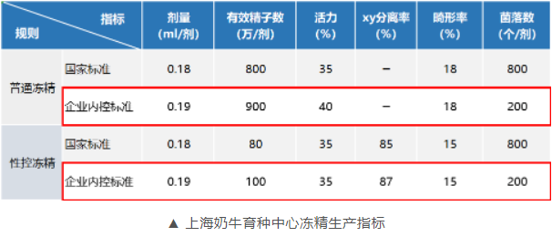 精液质量是影响牛群配种受胎率的关键因素。一直以来,上海奶牛育种中心有限公司冻精生产不仅严格执行牛冷冻精液(GB4143-2008)、牛性控冷冻精液国家标准(GB/T 31582-2015)等国家标准,同时还制定了高于国家标准的冻精生产企业内控指标。