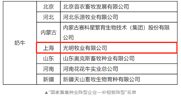 8月4日,农业农村部办公厅印发《关于扶持国家种业阵型企业发展的通知》(以下简称《通知》),光明牧业有限公司入选“国家畜禽种业阵型企业—补短板阵型”名单。