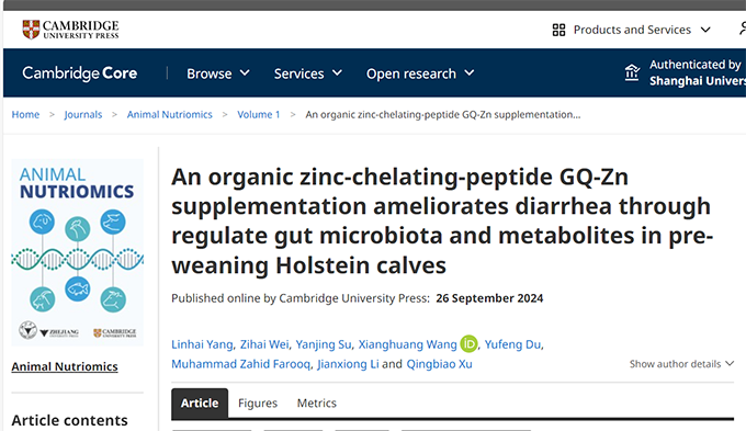 近日,光明牧业研究团队与华中农业大学研究团队联合在国际学术期刊《animal nutriomics》上在线发表论文《An organic zinc-chelating-peptide GQ-Zn supplementation ameliorates diarrhea through regulate gut microbiota and metabolites in pre-weaning Holstein calves》。该研究利用16S高通量测序和代谢组学技术,深入探讨了甘谷锌(Glycine-Glutamine-Zn,GQ-Zn)在缓解犊牛腹泻中的潜力。