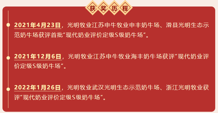 近日,中国奶业协会发布了2022年第一批现代奶业评价定级奶牛场名单。经现代奶业评价工作领导小组审核,认定光明牧业有限公司下属 武汉光明生态示范奶牛场有限公司、浙江光明牧业有限公司等7个奶牛场为“现代奶业评价定级S级奶牛场”。