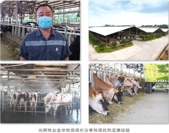 会上大家远程参观了光明牧业南方代表牧场—浙江光明牧业有限公司(下文称“金华牧场”)。金华牧场位于金华市汤溪镇石羊村,现养殖规模2200头,荷斯坦奶牛近1500头、娟珊牛700多头。金华和云南纬度相同,夏季都处于高温高湿的环境,防暑降温工作至关重要。金华牧场作为南方首个单产突破12吨的牧场,抗热应激工作成果显著,丁俞建场长也在线上就完善防暑降温设施、防暑降温流程的执行、加喷工作、日粮管理等方面做了详细介绍。