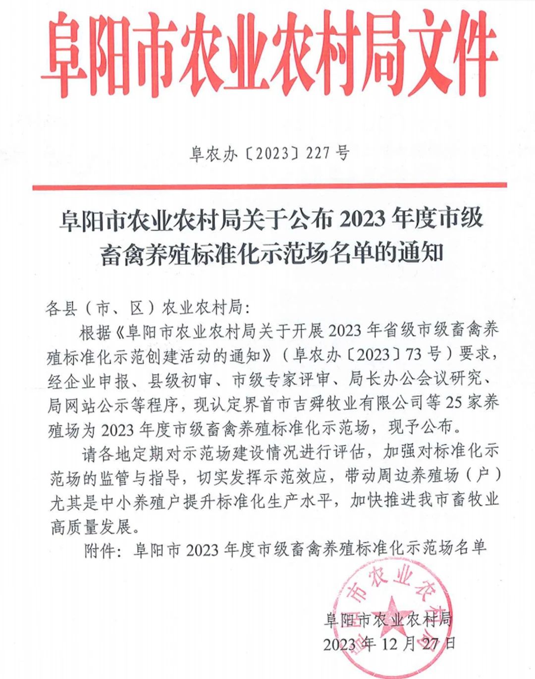 近日,安徽省阜阳市农业农村局公布2023年度市级畜禽养殖标准化示范场名单,光明牧业旗下阜阳光明生态智慧牧场榜上有名。