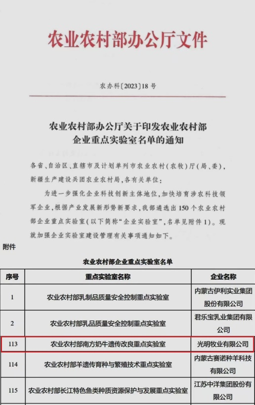 光明牧业拥有60年的奶牛养殖经验和技术积淀,“光明”品牌在业内已有相当的美誉度和知名度。公司高度重视种业科技创新、产学研合作和科技人才培养,依托“上海市企业技术中心”、“国家奶牛产业体系上海试验站”等科研平台,先后与中国农业科学院、中国农业大学和上海交通大学等国内知名院校在课题申报、人才培养、技术攻关、产品合作以及科研成果转化等方面建立了紧密合作关系。此次重点实验室的成功获批,是国家对光明科技创新能力的高度肯定。