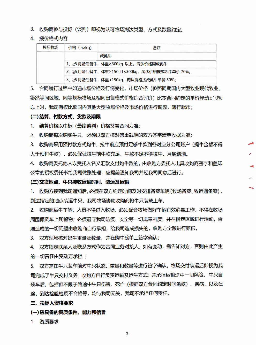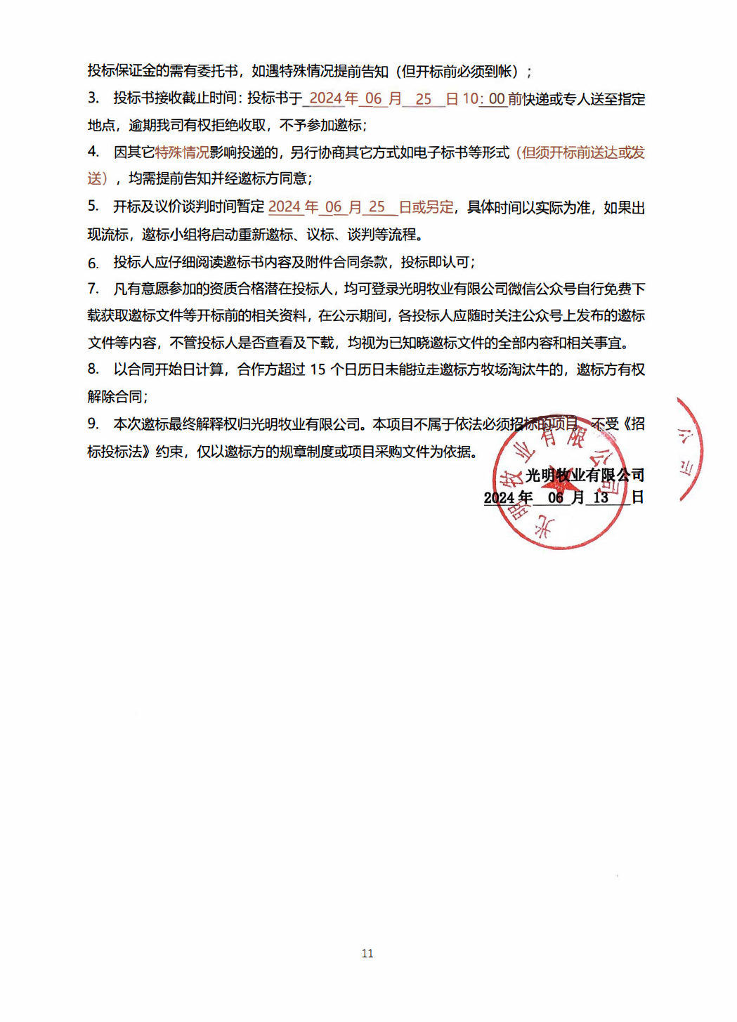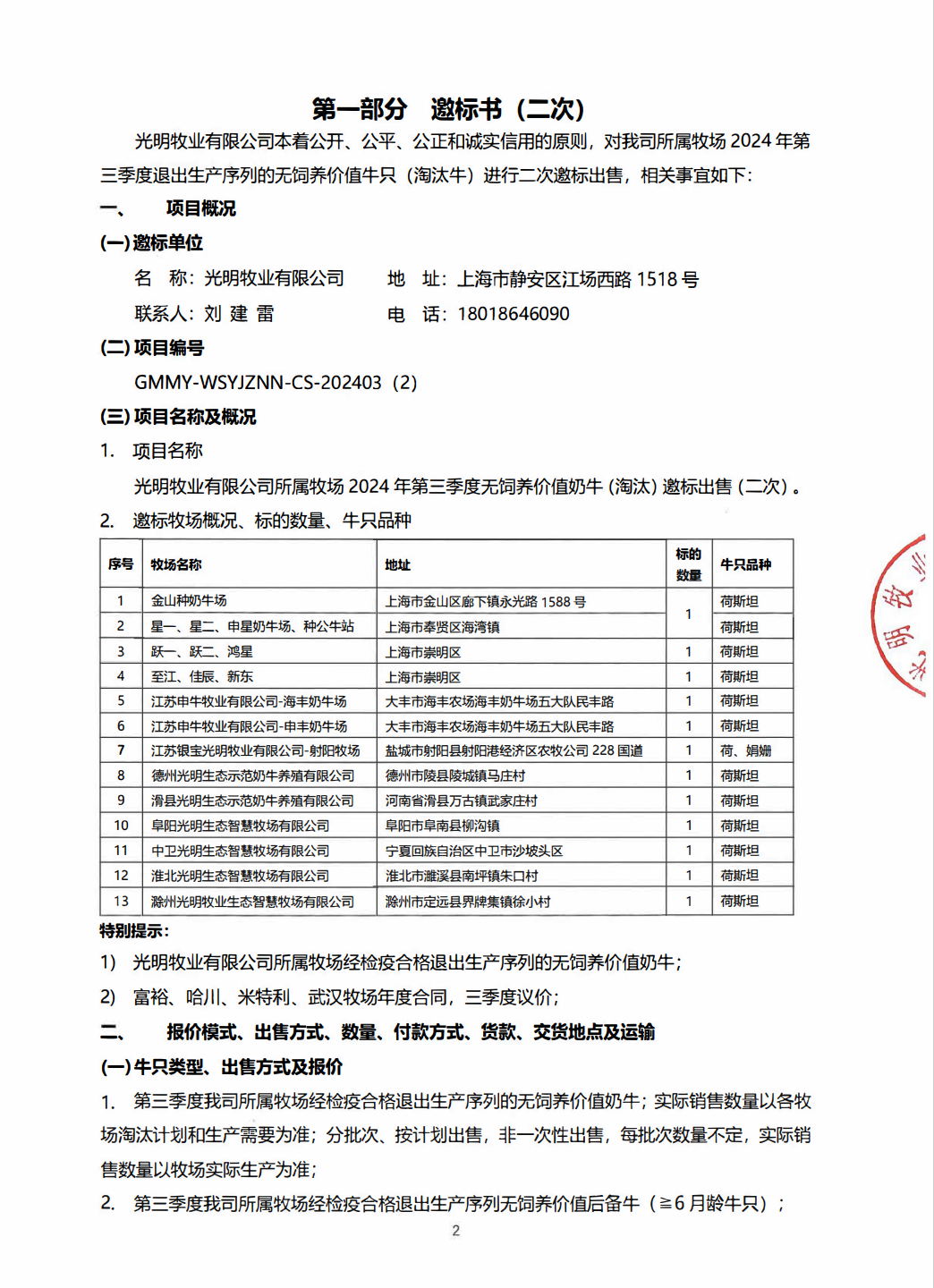 附件:(二次)光明牧业有限公司2024年第三季度无饲养价值牛只出售邀标书