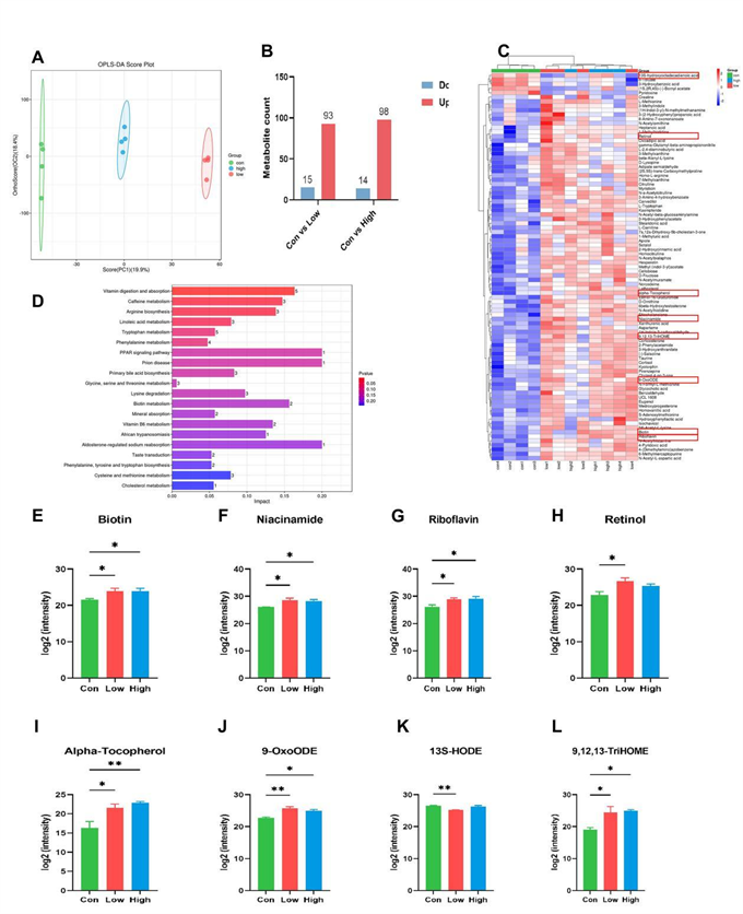 新生犊牛腹泻严重威胁哺乳犊牛健康,导致高患病率和巨大经济损失。抗生素滥用引发抗药性和环境污染,亟需寻找如锌这样的安全有效替代品,以促进肠道健康并减少依赖。研究发现,GQ-Zn显著降低了腹泻率,并通过调节氧化应激与炎症反应,有效减轻了肠道损伤。特别是,高剂量GQ-Zn(160mg/d)在降低血液中IL-2和IFN-γ等促炎性细胞因子的同时,增强了抗炎因子的表达,改变了肠道内容物中短链脂肪酸的浓度,显著促进了维生素消化吸收相关代谢途径。这些发现不仅为新型添加剂的开发提供了坚实的理论基础,也为畜牧业抗生素减量策略提供了可行的替代方案,展现了对犊牛肠道健康维护及临床应用转化的重大潜力。
